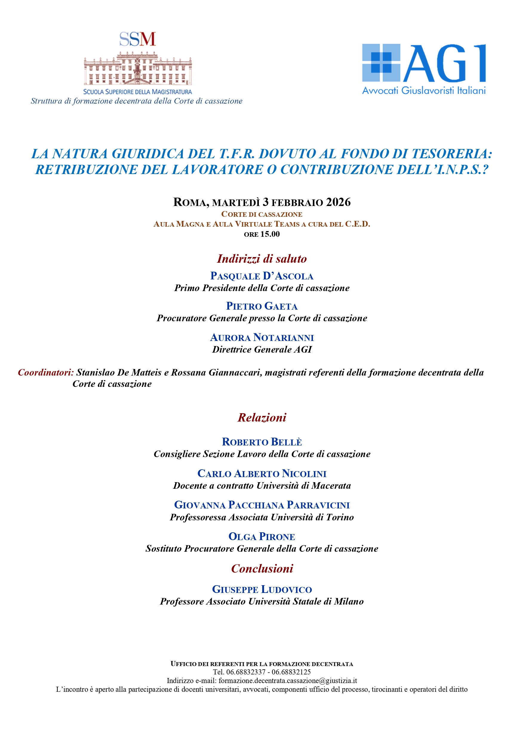 Si ricorda che Martedì 3 febbraio 2026 a partire dalle ore 15.00 come da programma che si allega, si terrà sia in Aula Magna che in Aula virtuale Teams, il convegno sul tema: La natura giuridica del T.F.R. dovuto al Fondo di tesoreria: retribuzione del lavoratore o contribuzione dell’INPS?, organizzato dalla Struttura di formazione decentrata presso la Corte di Cassazione.