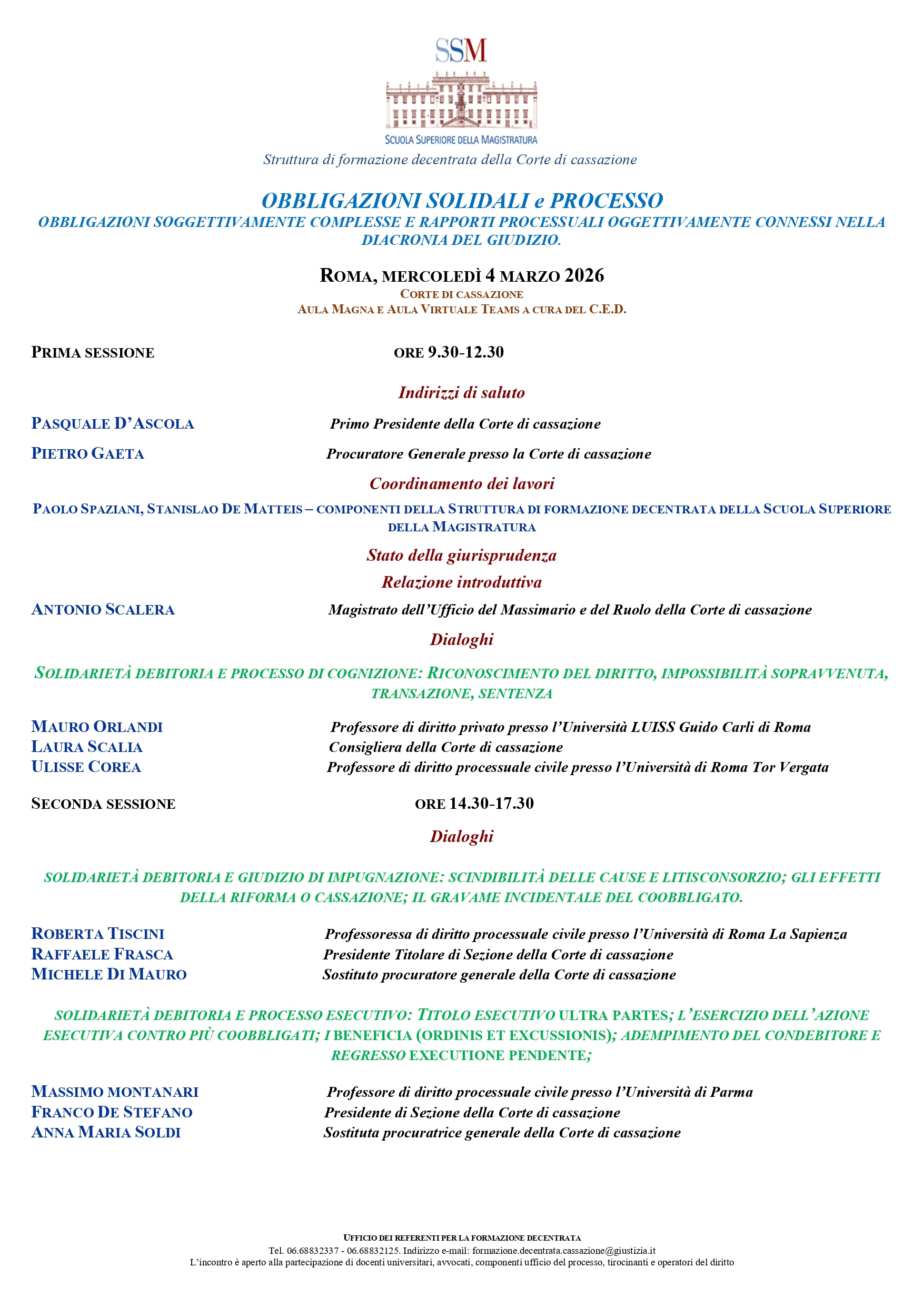 Si comunica che Mercoledì 4 marzo 2026 a partire dalle ore 9.30 come da programma che si allega, si terrà sia in Aula Magna che in Aula virtuale Teams, il convegno sul tema: Obbligazioni solidali e processo - Obbligazioni soggettivamente complesse e rapporti processuali oggettivamente connessi nella diacronia del giudizio, organizzato dalla Struttura di formazione decentrata presso la Corte di Cassazione.