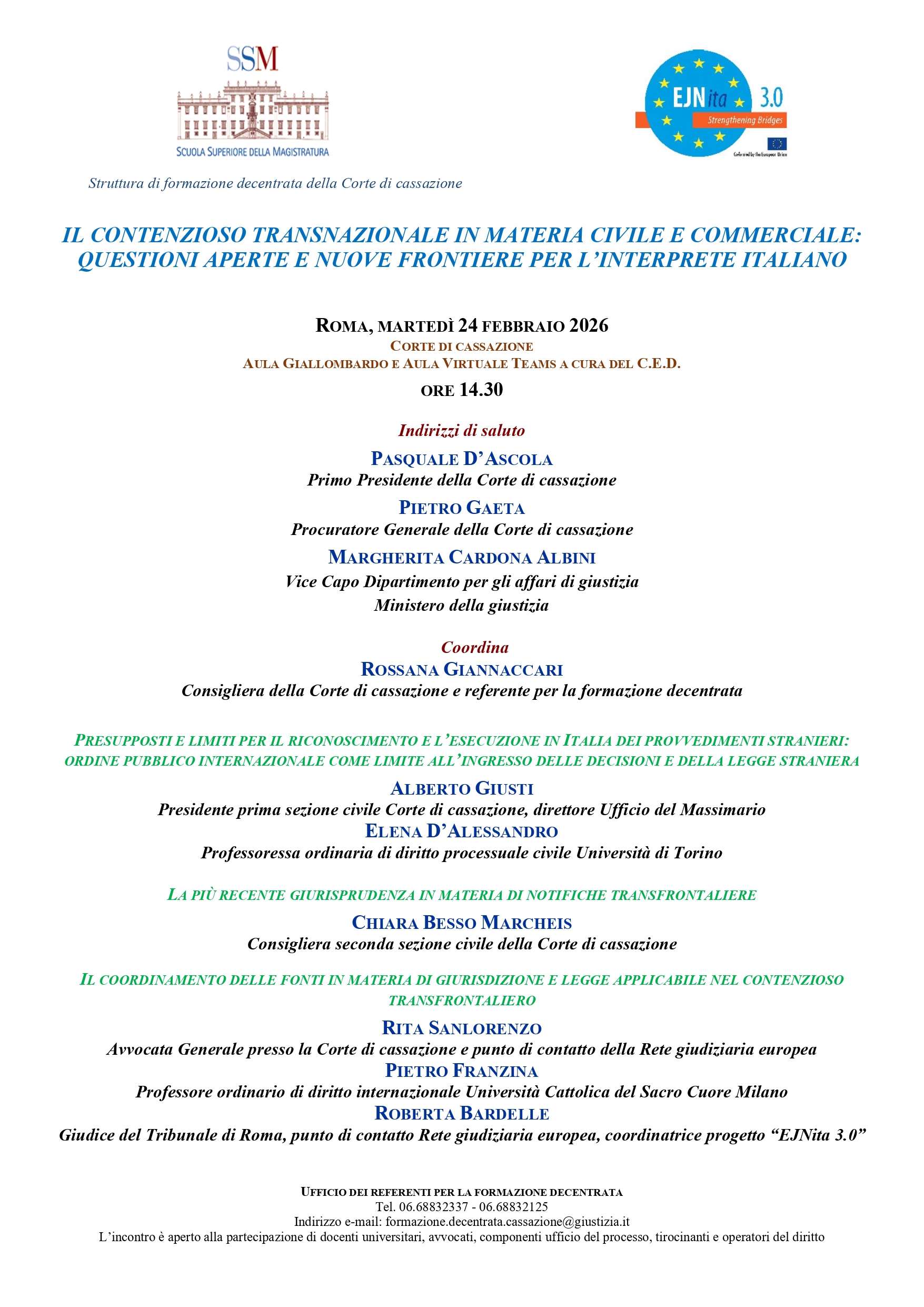 Si ricorda che Martedì 24 febbraio 2026 a partire dalle ore 14.30 come da programma che si allega, si terrà sia in Aula Giallombardo che in Aula virtuale Teams, il convegno sul tema: Il contenzioso transnazionale in materia civile e commerciale: questioni aperte e nuove frontiere per l’interprete italiano, organizzato dalla Struttura di formazione decentrata presso la Corte di Cassazione.