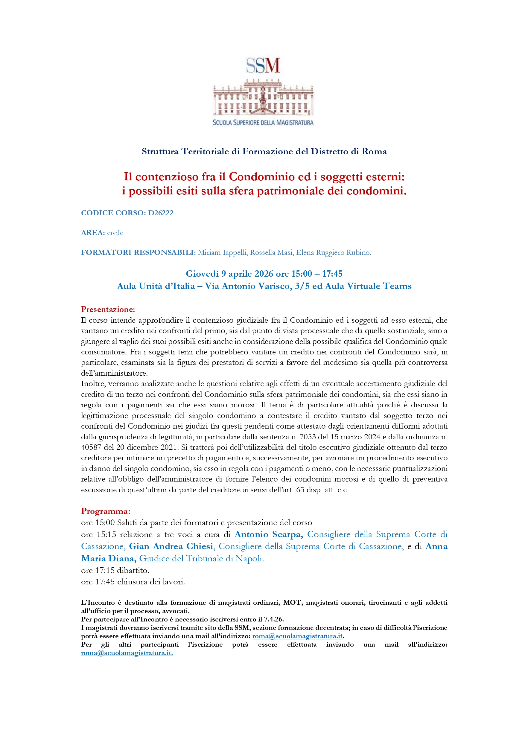 Il corso è destinato alla formazione di magistrati ordinari, Mot, onorari, tirocinanti, addetti all'Ufficio per il Processo, Avvocati.